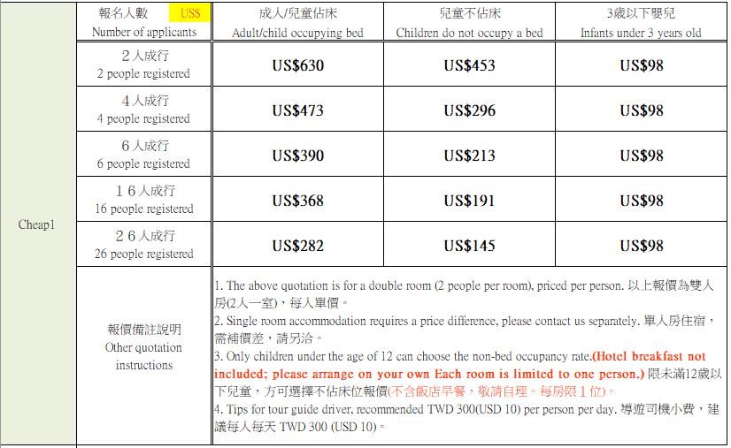 (2) Tips for tour guide driver, recommended TWD 300 per person per day. 導遊司機小費,建議每人每天 TWD 300 (USD10)