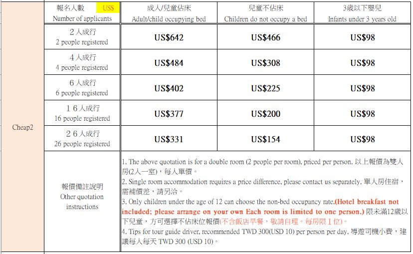 (2) Tips for tour guide driver, recommended TWD 300 per person per day. 導遊司機小費,建議每人每天 TWD 300 (USD10)