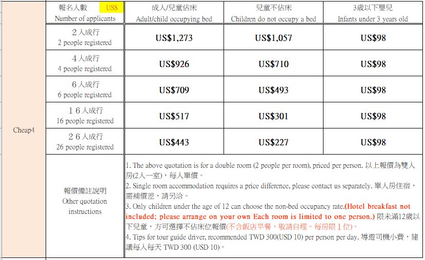 (4) Any expenses not specified in this itinerary, as well as any costs arising from recommendations, optional activities, or free time. 本行程表上未註明之各項開銷,建議、自費或自由行程所衍生之任何費用