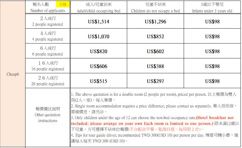 (4) Any expenses not specified in this itinerary, as well as any costs arising from recommendations, optional activities, or free time. 本行程表上未註明之各項開銷,建議、自費或自由行程所衍生之任何費用