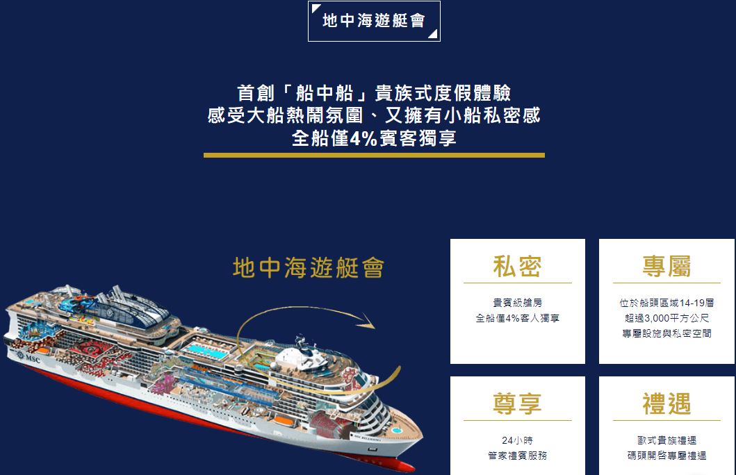 ⚓【MSC地中海遊艇會】 首創「船中船」貴族式度假體驗 感受大船熱鬧氛圍、又擁有小船私密感 全船僅4%賓客獨享。